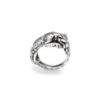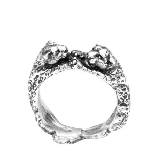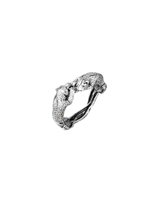 Questo anello in argento brunito raffigura due leopardi che si fronteggiano, con le zampe posate delicatamente sulla sommità del dito e le code intrecciate sotto. Realizzato completamente in azienda con l’antica tecnica della fusione a cera persa. Un anello iconico per chi ama i gioielli che trovano ispirazione nella natura e nel mondo Animalier.