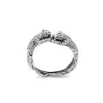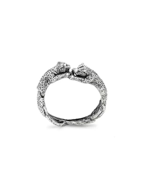 Due leopardi, languidamente adagiati uno di fronte all’altro, danno vita a questo bracciale in argento fuso a cera persa, dai volumi plastici. Iconico, per la sua capacità di fondere l’eleganza con la forza della natura. La brunitura enfatizza la texture del manto del felino, in una combinazione perfetta di forma e luminosità. Realizzati a mano in azienda