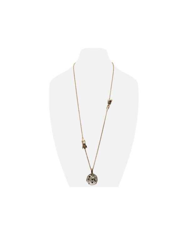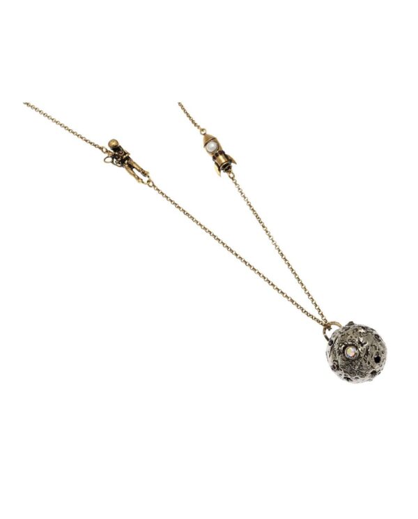 Collana con catena, astronauta e shuttle in ottone dorato, perla e granati. Pendente lavorato in ottone argentato, swarovski e granati – Dimensione H 2,6cm L 2,6cm Catena 80cm.