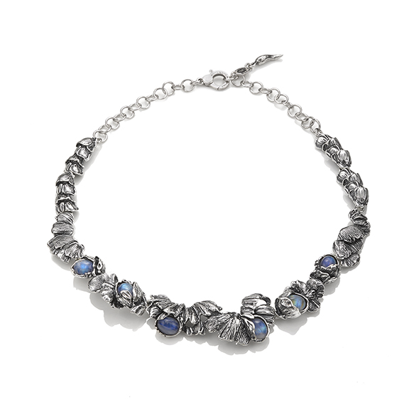 Collezione Moon Flower – Un fiore fatto di materia preziosa. L’argento incontra i riflessi meravigliosi e cangianti della pietra che i poeti chiamano moonlight stone.