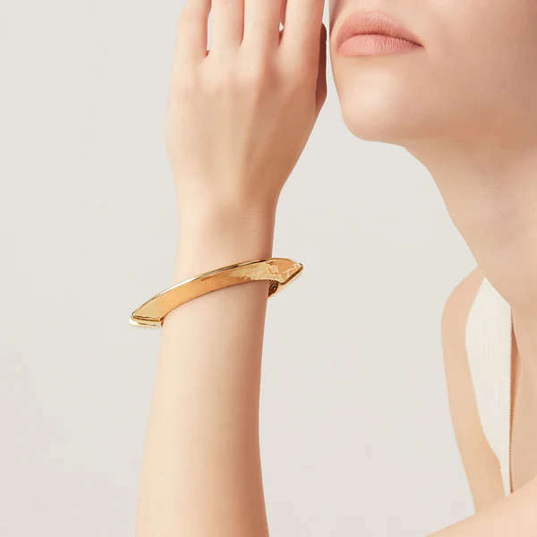 Il bracciale rigido Blade è caratterizzato da un indosso grintoso, grazie alle linee che disegnano forme decise ed eleganti. Per le donne che amano un argento di forte personalità e dal segno essenziale. Un connubio fra la forma più perfetta, il cerchio, ed il metallo martellato dalla calda luce dorata.