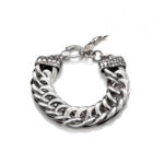 Un imponente maglia groumette che accompagna due finali in stile animalier coccodrillo. Morbido e sinuoso, avvolge morbidamente il polso della donna che lo indossa. Lavorato a mano in azienda.