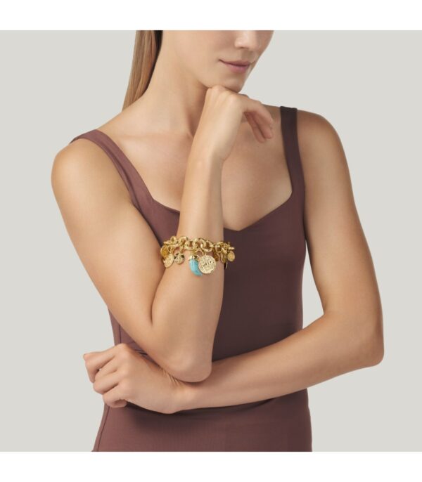 Tutto il fascino della fusione a cera persa in un bracciale a maglia tonda in bronzo dorato con finitura martellata, impreziosito da monete e da una zanna in pasta di turchese sormontata da un decoro a forma di puma. Luminosa e intensa, questa creazione dalle calde cromie è completata da una chiusura a T-bar. Un gioiello fatto a mano, simbolo dell’eleganza materica e della maestria artigianale di Giovanni Raspini.