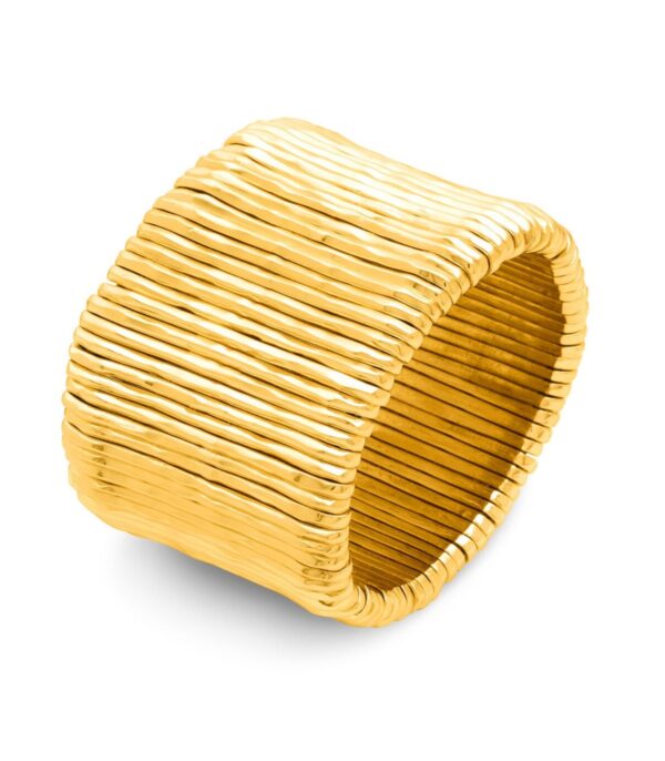 Un bracciale di grande impatto, dalla texture dinamica e contemporanea, capace di catturare la luce e suggerire un dinamismo visivo unico. La presenza di molle interne nascoste garantisce una vestibilità confortevole. Un gioiello fatto a mano, espressione dell’arte orafa e della maestria artigianale di Giovanni Raspini.