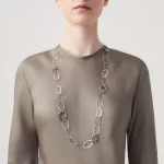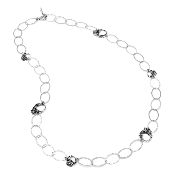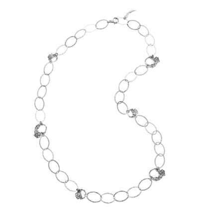 L’ispirazione marina, evergreen di Giovanni Raspini, si abbina in questa collana ad una maglia ovale martellata, per una grande leggerezza e luminosità. 102 centimetri di eleganza e bellezza contemporanee prendono forma nell’argento brunito