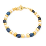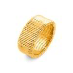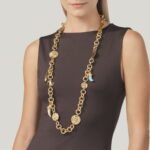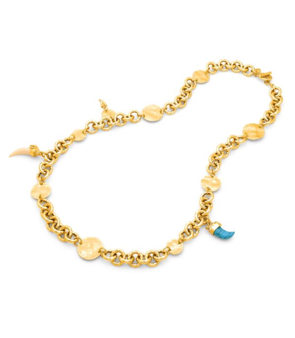 Una lunga ed elegante catena a maglia tonda in bronzo dorato con finitura martellata si arricchisce di eleganti dischi e di elementi decorativi ad ispirazione animale. Una creazione luminosa dalle calde cromie, completata da una chiusura a T-bar. Un gioiello fatto a mano, che esprime tutta la raffinatezza e la forza creativa di Giovanni Raspini.
