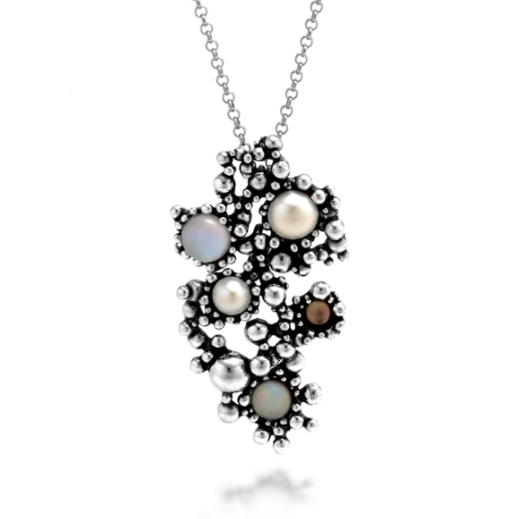 Collana in Argento 925, perle naturali, madreperla rosa e verde doppiate con quarzo.