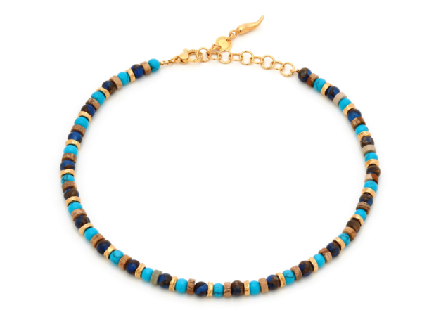 Argento 925 in bagno d’oro, turchese, agata blu con bronzite e pietra paesina