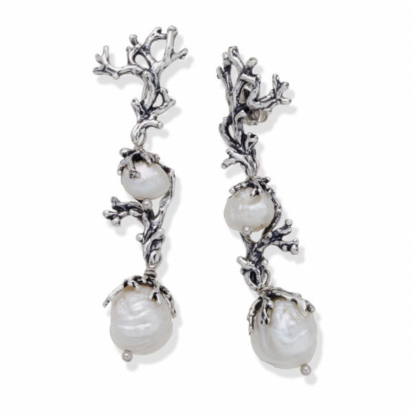 Collezione Mari del Sud – L’argento fluisce in forme coralline e si sposa con le perle naturali d’acqua dolce dai riflessi bianco opalescenti.