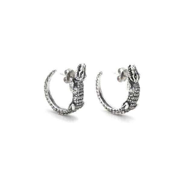 Vere e proprie sculture in miniatura, questi orecchini in argento brunito mostrano un coccodrillo che col corpo crea un elegante cerchio, mentre la testa dell’animale poggia delicatamente sul lobo dell’orecchio. Fatti a mano in azienda.