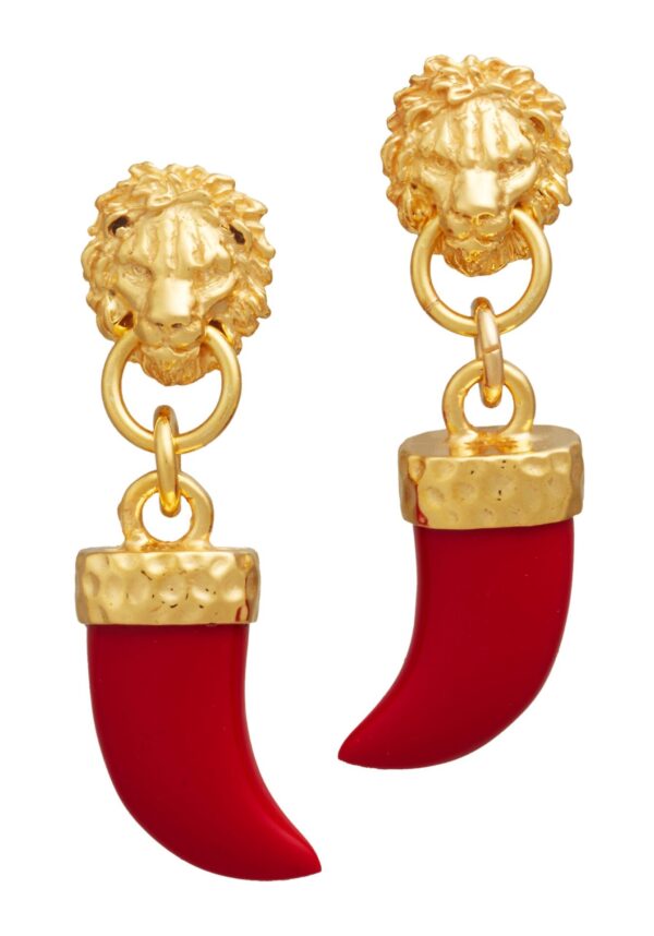 Le teste di leone, fuse a cera persa nell’argento e quindi dorate, sostengono due iconiche zanne in resina ecologica. I nostri orecchini, realizzati interamente a mano in azienda, regalano luce, colore e gioia.