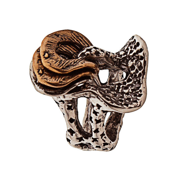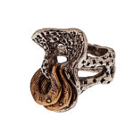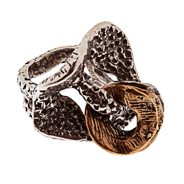 Anello in argento 925 e elementi in bronzo semovibili . Una linea morbida ed avvolgente , il movimento delle alghe tropicali viene riprodotto dagli elementi semovibili che sormontano il gambo dell’anello , un disegno unico ed affascinante per la donna che ama arricchire il proprio outfit con accessori sensuali e seducenti .