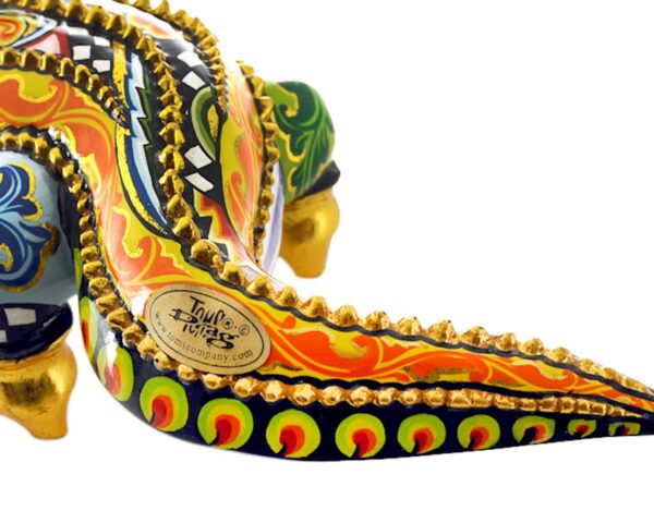 Il Coccodrillo “Fransceso” S di Toms Drag è una scultura decorativa unica nel suo genere. Realizzata in MDF, misura 42 cm di lunghezza e rappresenta un alligatore in un costume vivace e colorato tipico del design di Tom’s Drag. Nonostante il suo aspetto mordace, il suo look stravagante e giocoso lo rende un pezzo d’arte affascinante e divertente, perfetto per aggiungere un tocco di originalità e colore a qualsiasi ambiente. Ideale per chi ama il design eccentrico e vuole arricchire la propria collezione con un pezzo distintivo.